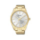 A modern timepiece that displays classic aesthetic appeal. The looks of this watch are equally matched by its reliability. A smooth silver/white sleek dial with gold accents and oxhide brown leather bracelet. Features include Day/ Date, and low charge indicator. Powered by our Eco drive, never needs a battery, only a light source.