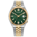 Time for a style upgrade? The Citizen TSUYOSA 60 watch brings ultramodern sports flair directly to your wrist with its eye-catching two-tone stainless-steel case and integrated five-link bracelet. Enjoy the finely machined sunray green dial, complete with a date window and shimmering gold-tone accents, all protected by a scratch-resistant sapphire crystal. This automatic timepiece boasts a 60-hour power reserve and 166ft water resistance, making it perfect for every adventure, from the boardroom to the beach. It's truly a daily-wear choice ready for anything!