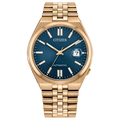 Discover the Citizen TSUYOSA 60, an ultramodern automatic timepiece featuring sophisticated rose gold-tone stainless steel and a striking sunray blue dial. Its integrated five-link bracelet ensures a sleek fit, ready for any occasion. Enjoy the reliability of an automatic movement with a 60-hour power reserve, plus 166 feet of water resistance for daily adventures. This refined watch is your perfect companion, blending style and functionality effortlessly.